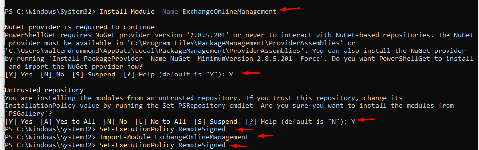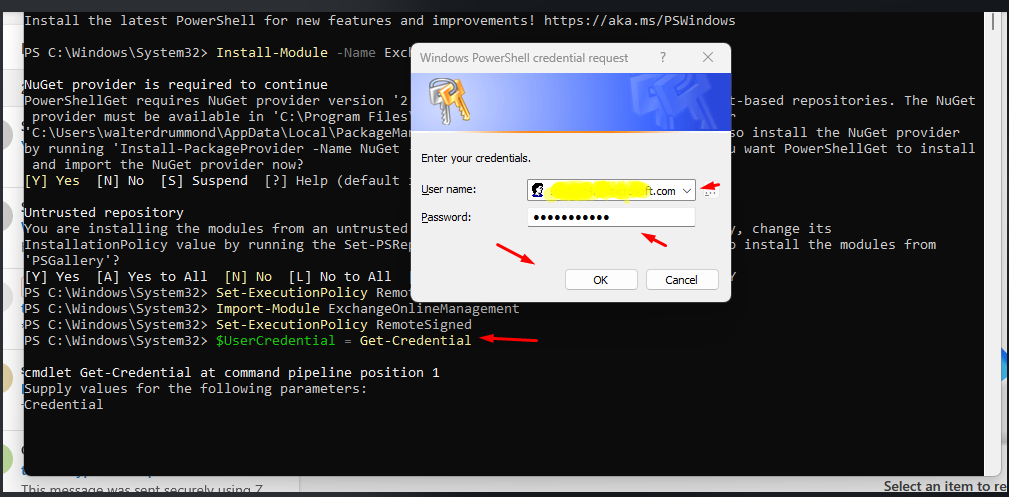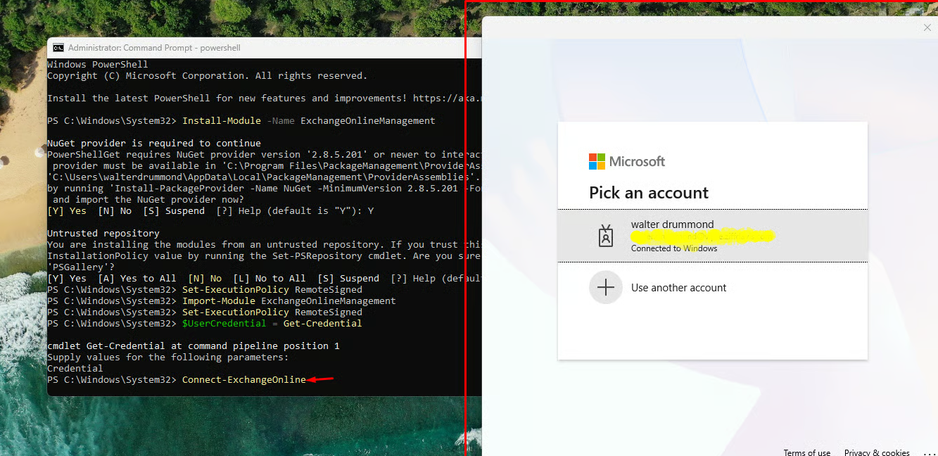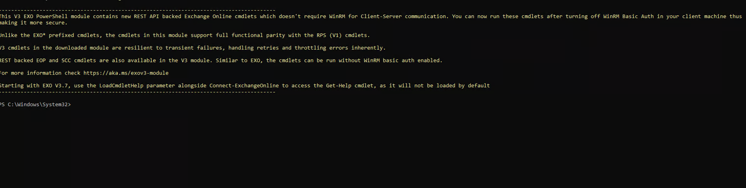 8. You will see a message in PowerShell showing Exchange Online is connect to PowerShell.